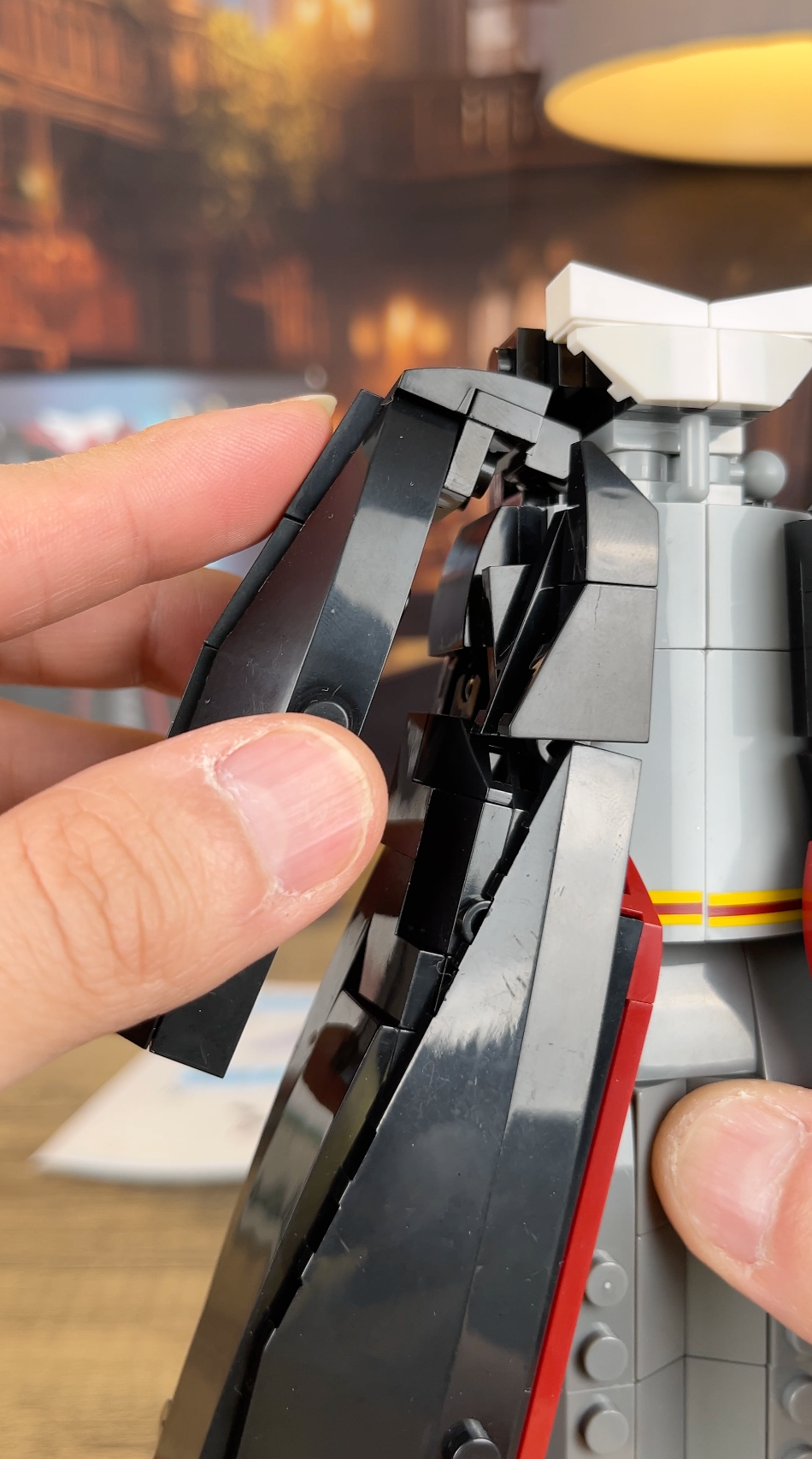 Inspired by the timeless look of legendary wizarding school uniforms, this build captures layered black panels, deep crimson lining, and classic crest detailing — crafted as a striking display piece for true collectors.